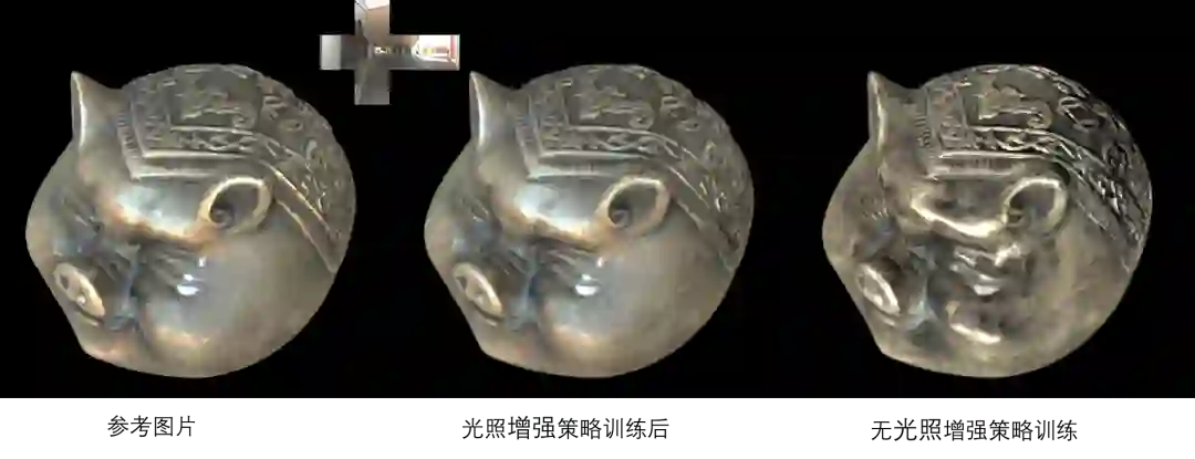 然而,由于训练数据仅包含点光源,深度渲染网络无法很好地处理带有颜色的或者低频的光照,从而导致网络的输出带有明显瑕疵。为此,全新的光照增强策略被提出,以解决光照泛用性问题。其核心思路是使用经典的基于图片的重光照方法来合成环境光照下的渲染图片数据集,然后在该增强的环境光照数据集和原拍摄的点光源数据集下一起训练。图3展示了对比结果,从图中可以看出,光照增强策略可以显著提升在环境光照下的结果质量。关于提出的深度表达的参数细节以及其他实现细节,感兴趣的读者可以深度阅读论文。