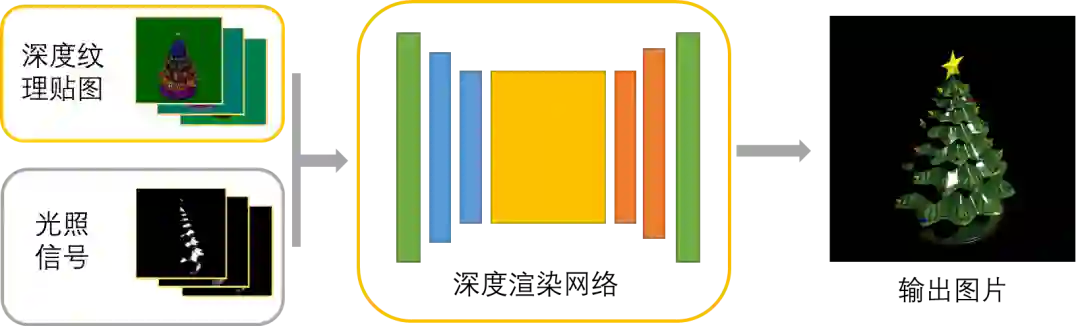图2展示了该方法的主要流程——首先将投影到屏幕空间的可学习的深度纹理贴图与预先渲染得到的光照信号相乘,接着将其输入给深度渲染网络,最后输出渲染结果。