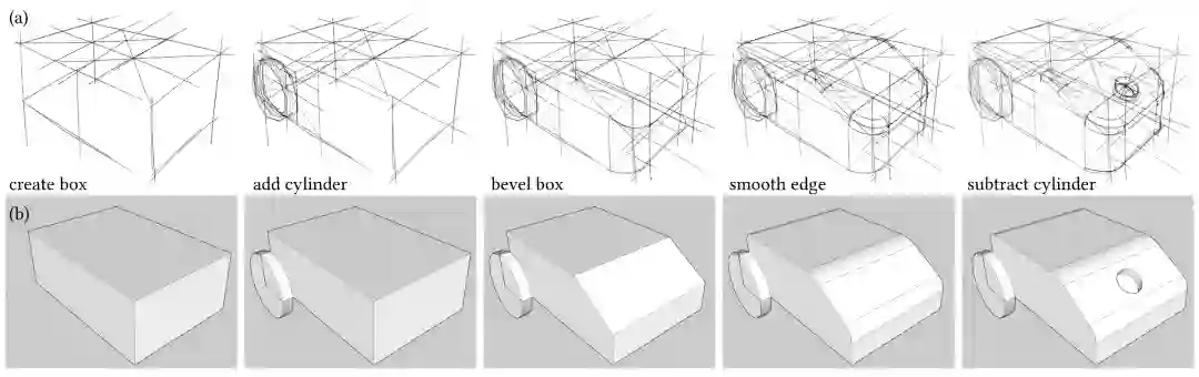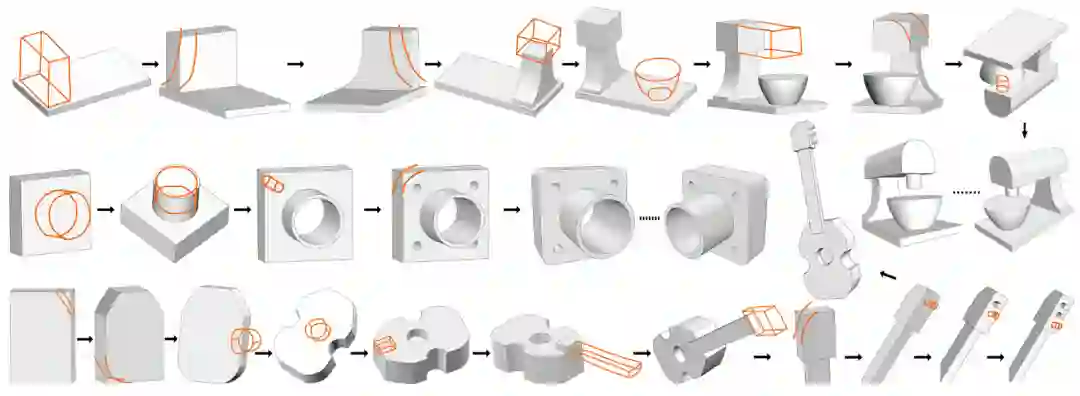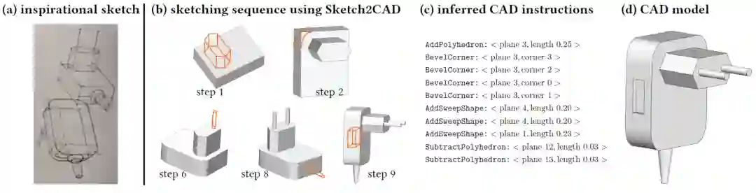 传统的产品设计流程从概念设计开始,由工程师建模转化为 CAD 模型,再经分析验证后进行生产制造。在概念设计阶段,设计人员为了便捷构思和自由表达,往往以绘制草图的方式完成。如图7所示,草图绘制的过程(第一行)是很明显的从主体到细节的序列,其顺序与软件建模 CAD 的过程(第二行)非常类似。为了加速从设计到建模的迭代,减少人力成本,微软亚洲研究院的研究员与合作者们提出了将草图绘制序列翻译成 CAD 建模操作序列的方法 Sketch2CAD,从而实现直观、自然的 CAD 建模(图8)。