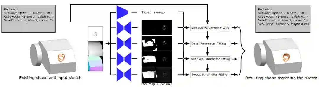 图9:给定一个部分构造的三维模型和重叠其上的二维草图,机器学习模型首先提取深度和法向图作为上下文信息,然后合并草图信息进行 CAD 操作的识别和关键操作参数的回归。之后进一步进行几何优化来确定 CAD 操作的所有参数。由此完成了一组草图到 CAD 操作的转换。