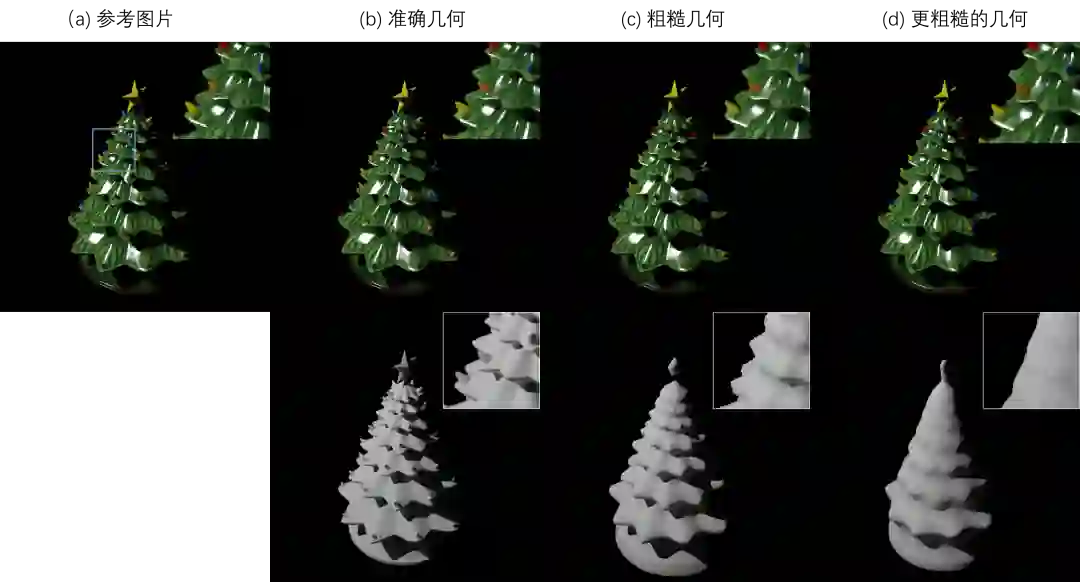 此外,本篇论文提出的方法还对粗糙几何的误差具有鲁棒性。图6展示了不同“粗糙”层次的粗糙几何的结果。其中 (c) 对应的粗糙几何的质量类似于在真实拍摄中重建的物体几何质量,而 (d) 是一个更加粗糙的版本,可以看到在 (c)、 (d) 中,几何存在很多缺失和不匹配,例如树上端的星形已经几乎消失,但仍然可以给出高逼真的渲染结果。
