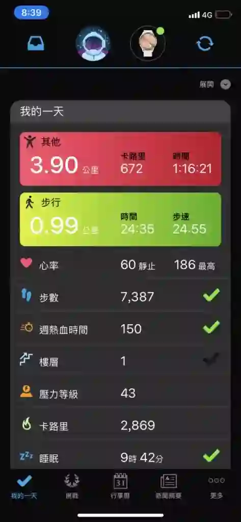 佩戴过Applewatch的同学都知道有一个自带功能很实用——正念呼吸。这次Garmin也拾人牙慧,把这项功能配合震动马达给搬了过来,简单体验感觉还不错,包括全天的压力测试指数,也能起到告诉自己“稳住能赢”的提神功效!此外还有一些比如预设的运动目标达成后会出现和Applewatch一样的庆祝画面,同时软件端也集成了徽章成就的项目,给用户营造了更多的参与感,某种程度上鼓励日常坚持佩戴;全天候24h的一套检测功能进一步得让这款表的功能体现了vivo系列的定义——健康生活。