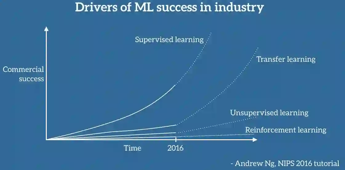 不容置疑,机器学习在产业界的应用和成功主要是受监督学习的驱动。受到深度学习中的进步、更强大的计算资源以及大量的标签数据集的推动,监督学习是人们对人工智能的兴趣复苏浪潮、多轮融资以及收购的主要原因,尤其是我们近年来看到的机器学习的应用,它们已经成为了我们生活的一部分。如果我们忽视关于另一个人工智能寒冬的怀疑和传言,并且相信吴恩达的预见,这种成功很可能会持续下去。