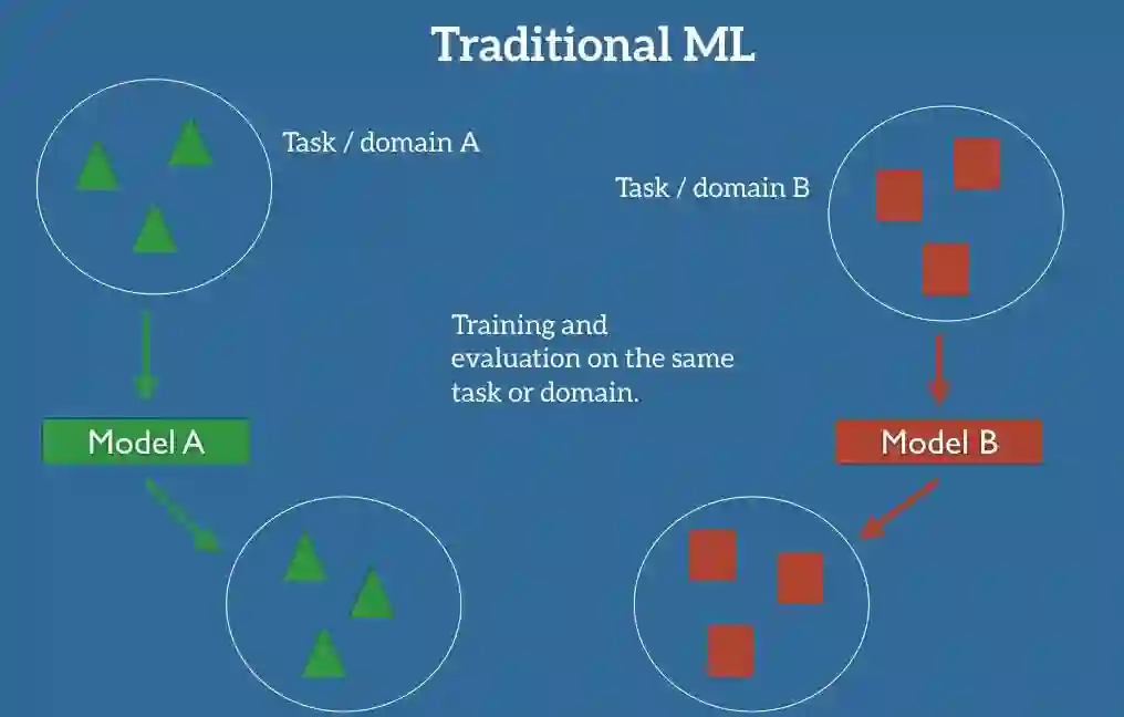 在机器学习的经典监督学习场景中,如果我们要针对一些任务和域 A 训练一个模型,我们会假设被提供了针对同一个域和任务的标签数据。我们可以在图 1 中清楚地看到这一点,其中我们的模型 A 在训练数据和测试数据中的域和任务都是一样的(后面我会详细地定义什么是任务(task),以及什么是域(domain))。现在,让我们假设,一个任务就是我们的模型要去执行的目标,例如,识别图片中的物体;而域就是数据的来源,例如,来自于旧金山的咖啡店的照片。