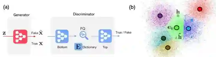 图6:(a)FQ-GAN架构:我们的FQ可以作为标准GAN区分器中的新层来添加进去。(b)用字典查找来实现隐式特征匹配。相同颜色的小散点们表示可以量化为相同中心(大圆圈)的连续特征;在经过FQ之后,真实特征(正方形)和伪特征(三角形)会共享相同的中心。