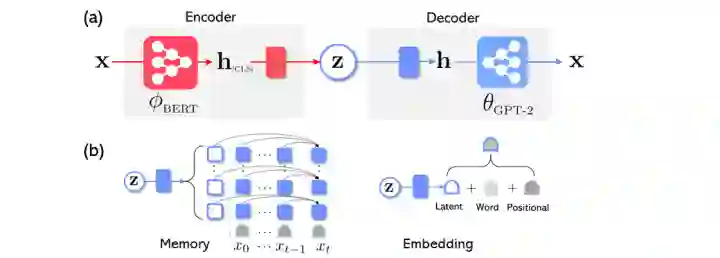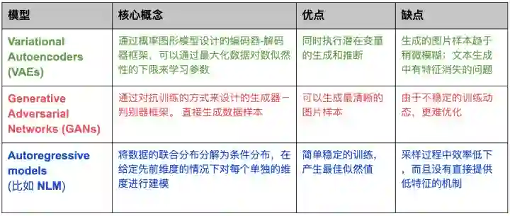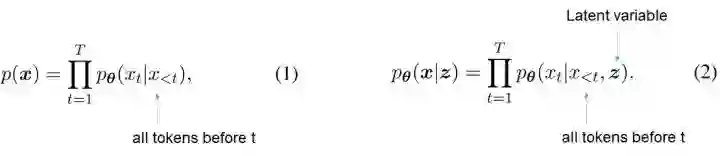 ,如式(1)所示。GPT-2也许是最著名的自回归模型NLM的实例,其优势来自由于在大量文本上进行预训练。这种自回归模型缺乏一种由高层语义指导的生成的能力。相反,VAE生成