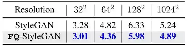 表格2:FQ对StyleGAN的提升。在FFHQ数据集上不同分辨率下的 FID-50k scores (越低越好)。