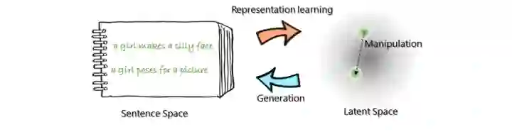 原理上来说,变分自动编码器(VAE)经过有效训练后,既可以作为强大的生成模型使用,又可以作为自然语言的有效表示学习框架来使用。VAE把句子表示在低维的特征空间中,通过操纵句子对应的特征向量表示来轻松操纵句子语义上的变化(比如使用可解释的向量运算符等),操作后的向量作为整体语义的概要,来指导句子的生成。例如,基本款的VAE就提供了一种由先验分布来指定的特征平滑的正则化。下图展示了VAE操纵句子变换的过程。