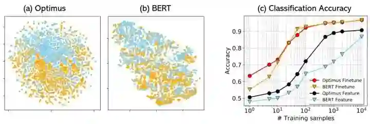 图5:(a)和(b)分别展示了使用tSNE对Optimus和BERT进行特征空间可视化的结果。具有不同标签的句子以不同的颜色呈现。(c)不同数量的带有标签数据的结果