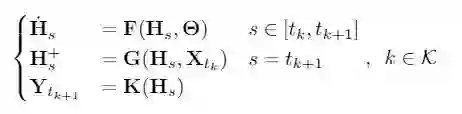 与只具有离散跳跃的标准递归模型相比,自回归 GDE 在跳跃间包含了一个潜在特征节点的连续流 H。自回归 GDE 的这一特性使它们能够从不规则的观测结果中来跟踪动态系统。