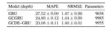 由于 GCDE-GRU 和 GCGRU 的设计在结构和参数数量上是匹配的,我们可以在 NRSME 中测量到 3% 的性能增长,在MAPE中测量到7%的性能增长。