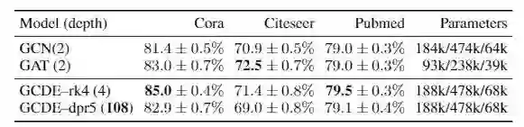 通过在 Cora、Pubmed 和 Citeseer 上进行一系列半监督节点分类实验,证明 GDE 可以作为高性能的通用模型。这些数据集包含静态图,其中邻接矩阵 A 保持不变,从而使其远离运用GDE的动态系统设置。我们评估图卷积常微分方程(GCDE)的性能,定义为: