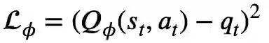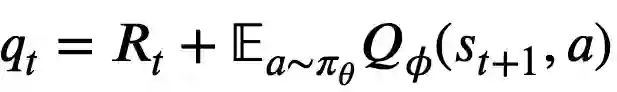 Critic 网络构建。Critic 的目标是高效地建模来自强化学习(即 MDP 环境)和模仿学习(即鉴别器)的奖励信息。给定状态, Critic 网络计算每个动作 𝑎_𝑡 的价值为 Q_ϕ (s_t,a_t),并利用时间差分方法来学习 Critic 网络。首先根据贝尔曼方程计算学习目标:
