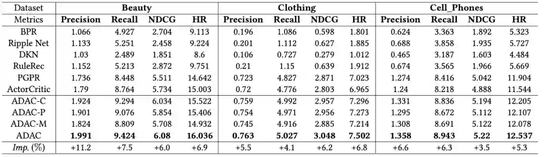 我们在亚马逊三种不同的物品类别上验证了提出的模型:Beauty(美妆产品)、Clothing Shoes and Jewelry(服饰鞋帽)和 Cell Phones and Accessories(手机及配件)。这里为了公平只用了最短路径得到示例(没有额外人工标注)。实验结果表明,与基线方法相比,Actor-Critic 方法在推荐准确性方面取得了更好的结果。