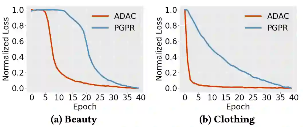 比较 ADAC 在 Beauty 和 Clothing 数据集上的收敛性可以看到,ADAC 通过有效利用示例路径在路径级别和元路径级别的信息实现了高效地收敛。
