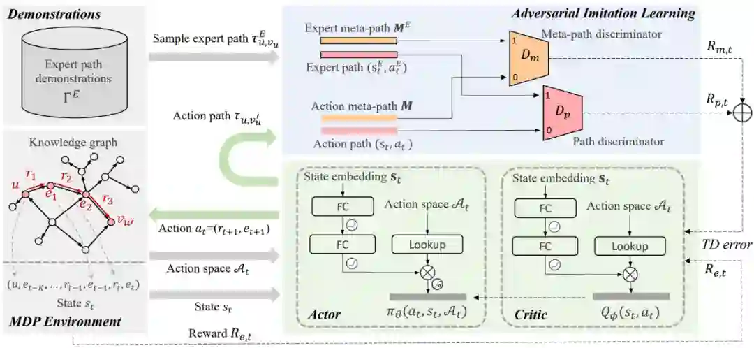 如图1所示的模型框架。其中,知识图谱是马尔科夫决策过程环境(MDP environment)的一部分。Actor 用来学习路径搜索策略,它与 MDP 环境进行交互,从而得到知识图谱上的搜索状态(State)和可能的行为(Action)。通过环境给出的奖励(reward)反馈 𝑅_𝑒,𝑡,Actor 判断现在的策略是否是用户感兴趣的。为了进一步集成示例路径,我们设计了一个对抗模仿学习模块(蓝色部分),包含有两个鉴别器(Discriminator)。鉴别器用来区分专家路径和 Actor 生成的路径,而 Actor 通过模仿专家示例路径,来“混淆”鉴别器,使它更难作出区分。当动作路径与专家示例路径在元路径级别(Meta-path Level)相似和路径级别(Path Level)相似时,模仿学习模块就会分别给 Actor 以更高的元路径奖励 𝑅_𝑚,𝑡 及路径奖励 𝑅_𝑝,𝑡。这样就得到了三种类型的奖励,𝑅_𝑒,𝑡、𝑅_𝑚,𝑡 和 𝑅_𝑝,𝑡。它们进一步由 Critic 建模,来精确地预测每个动作的价值。通过奖励梯度的无偏估计,学得的价值信息就用来训练 Actor。