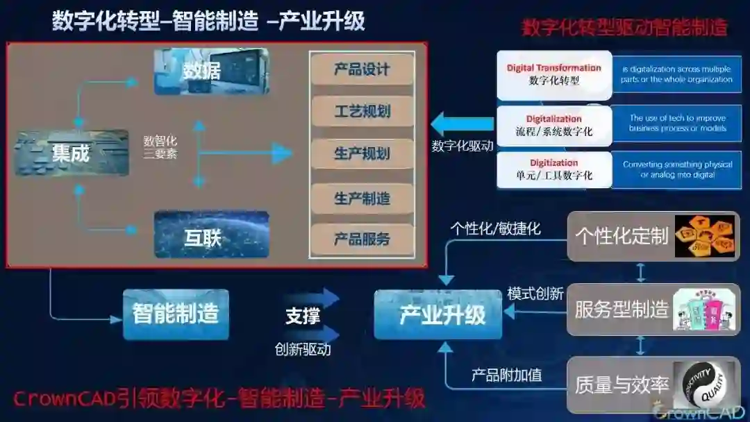 前面已经提到,CrownCAD 的目标其实不仅仅是提供一套工具,更重要的是以它为基础的个性化定制平台和平台所附加的服务,这些都有助于提高生产效率,进而增加产品的附加值。智能制造是实现这一切的关键支撑,而数字化转型又是智能制造的基础。所以说,