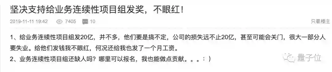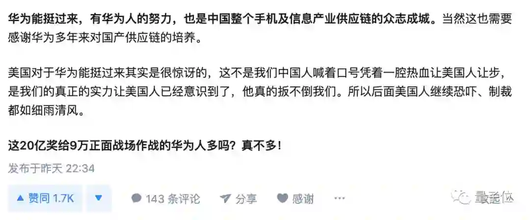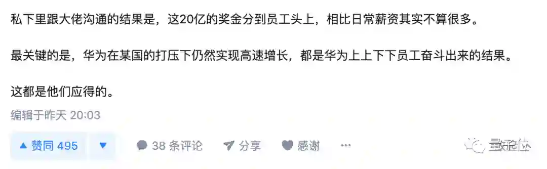 虽然20亿奖金并不是每一位华为员工都有份,但业务连续性项目组以外的华为员工也表示:资瓷。