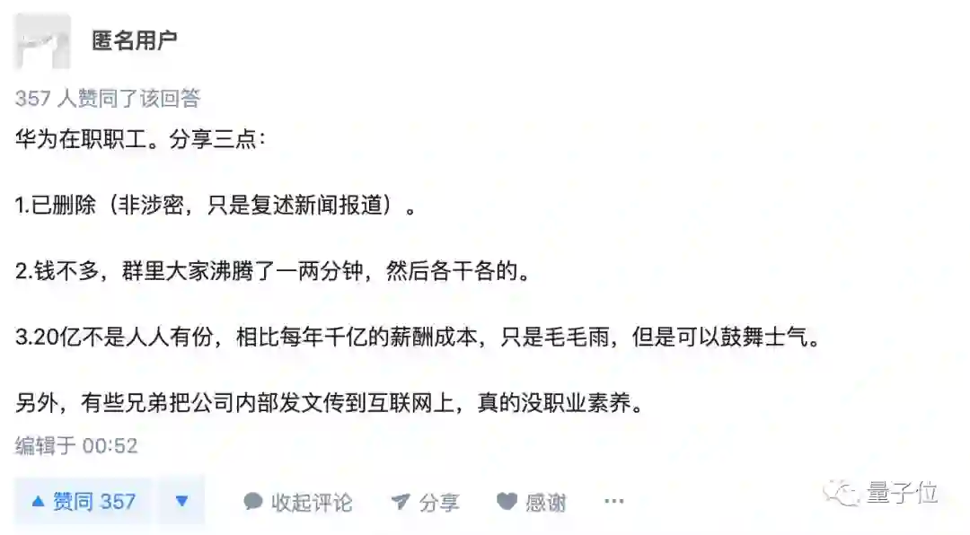 还有网友指出,其实这20亿奖金分到员工头上,相比于他们的薪资其实并不多(一个人平均估计2w多),重点在于鼓舞士气。