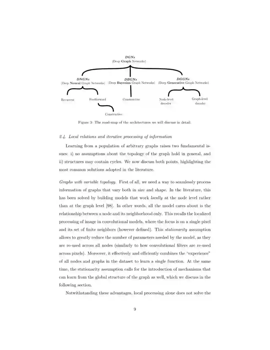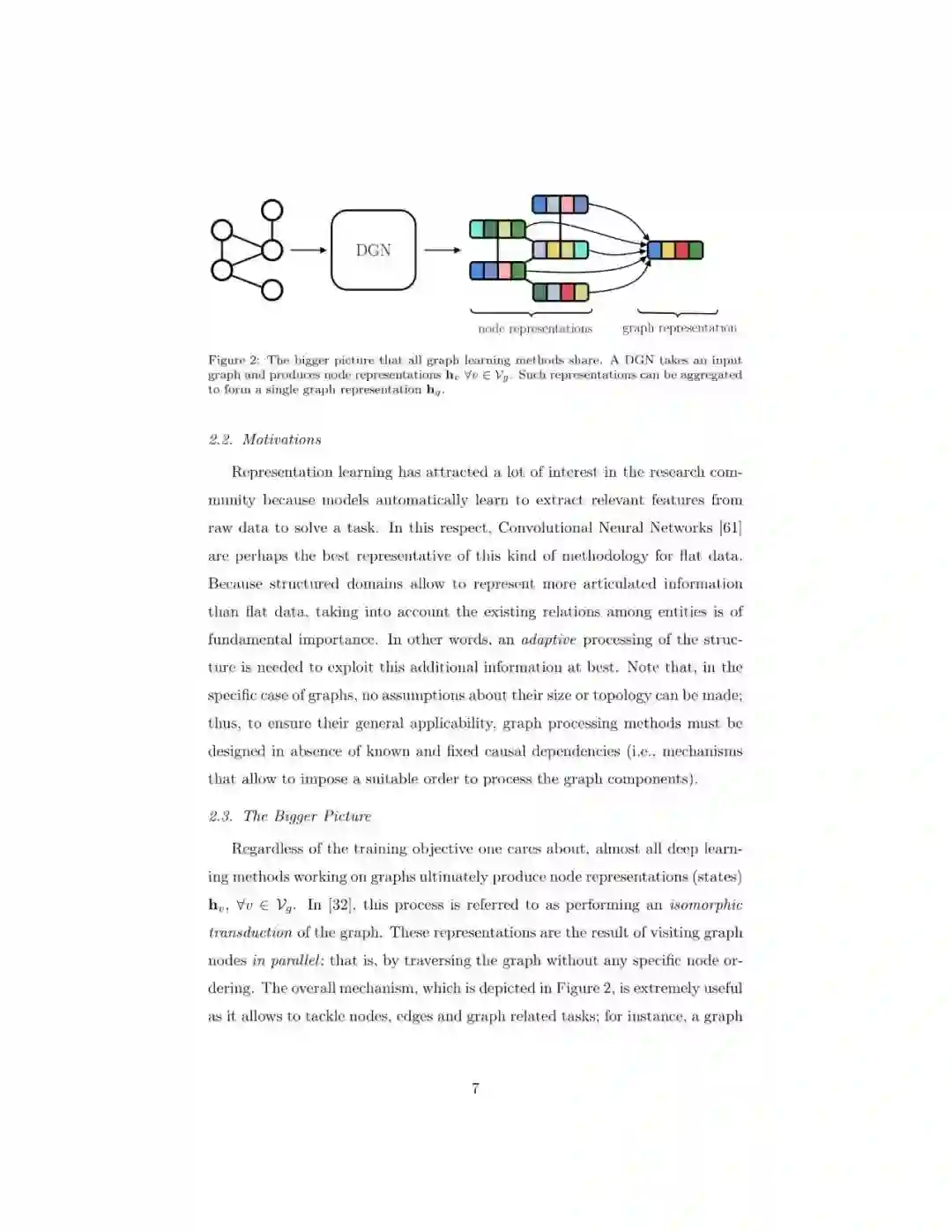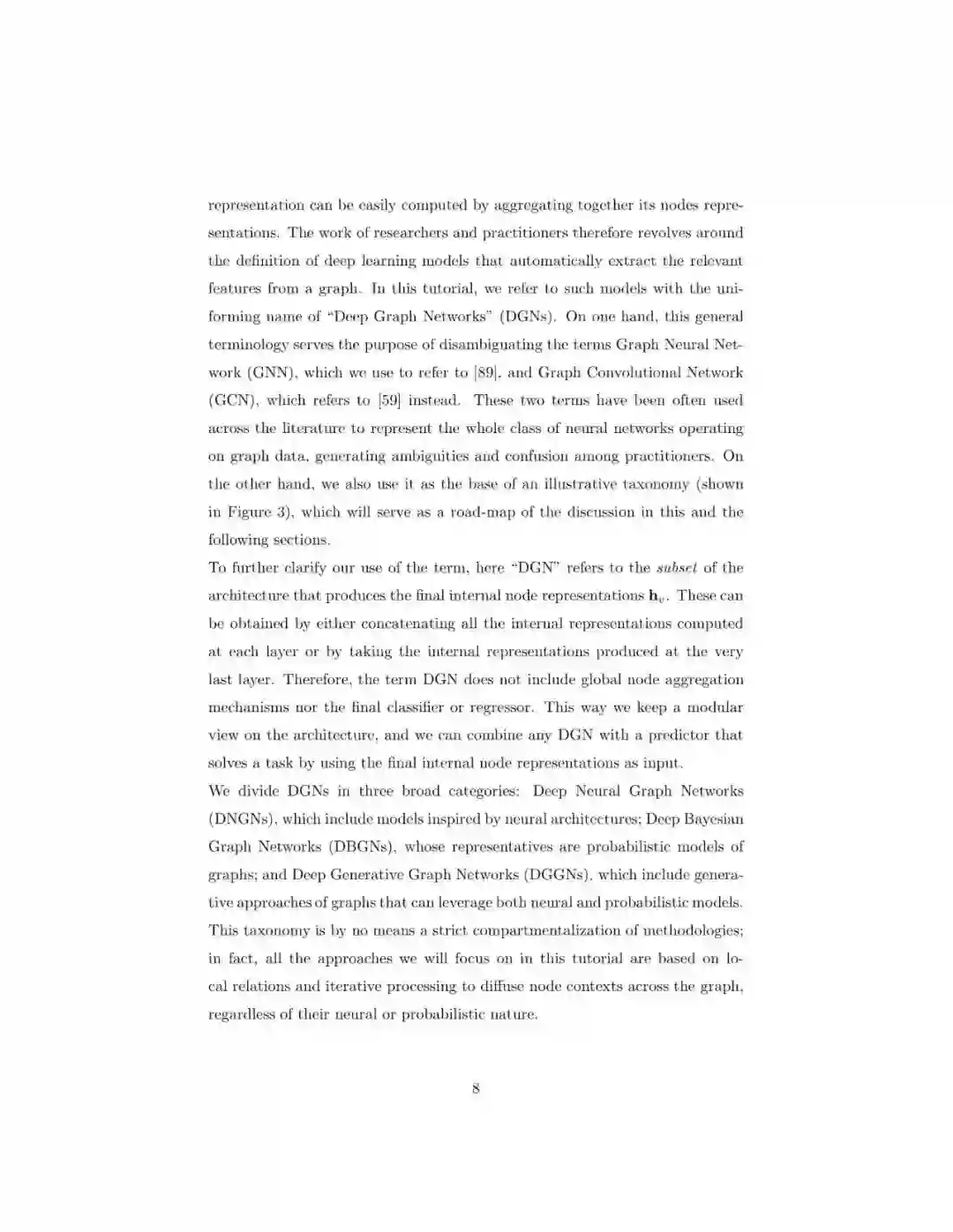 教程在介绍概念和想法时采用了自上而下的方法并保留了清晰的历史观点,为此,导论在第2节中提供了图表示学习的泛化形式,将图表示学习泛化为一种基于局部和迭代的结构化信息处理过程。同时,介绍了架构路线图,整个导论也是围绕该路线图进行开展的。导论聚焦于面向局部和迭代的信息处理过程,因为这些过程与神经网络的体系更为一致。因此,导论会淡化那些基于图谱理论的全局方法(假设有一个固定的邻接矩阵)。