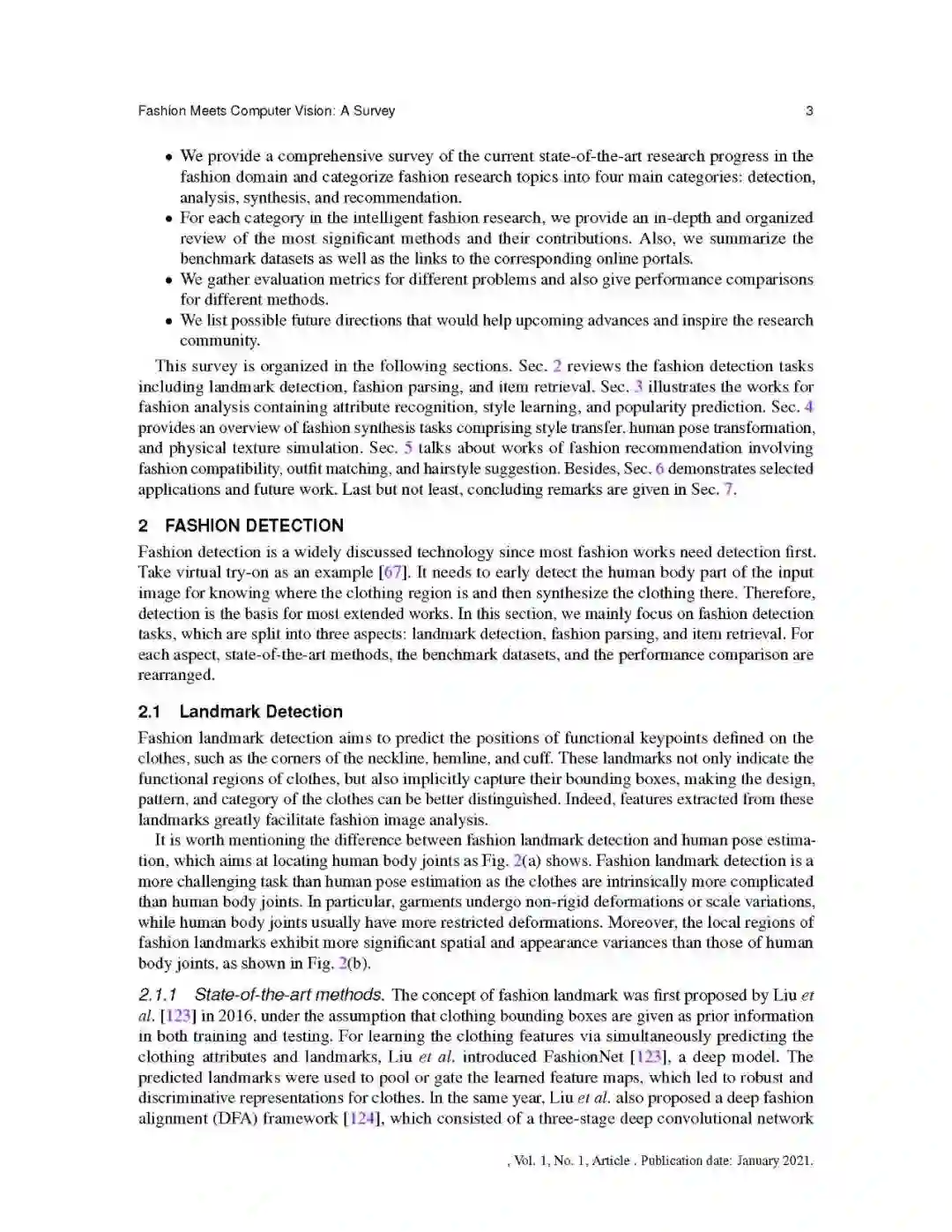 本综述的组织部分如下。第二节回顾了时尚检测任务,包括地标检测、时尚解析和条目检索。第3节说明了包含属性识别、风格学习和流行度预测的时装分析工作。第4节提供了时装合成任务的概述,包括风格转换、人体姿势转换和物理纹理模拟。第五节介绍时尚推荐作品,包括时尚搭配、服装搭配、发型建议。此外,第6节展示了选定的应用和未来的工作。最后但并非最不重要的是,结束语在第7节给出。