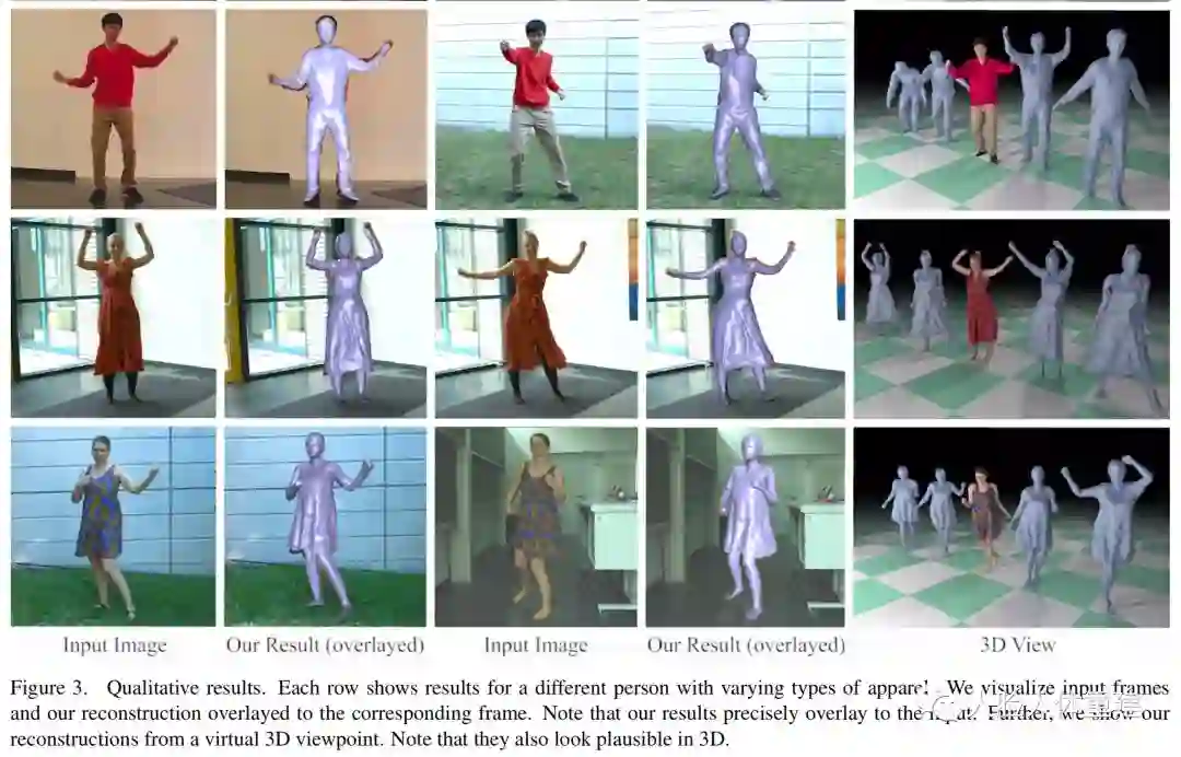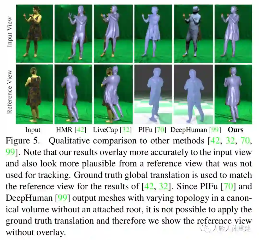 作者还将文章方法与之前方法包括 HMR [CVPR 2018]、LiveCap [SIGGRAPH 2019]、PIFu [ICCV 2019] 和 DeepHuman [ICCV 2019] 进行了定性和定量的比较,下面展示了定性比较的结果,本文的结果更加准确,在追踪阶段更加稳定鲁棒。