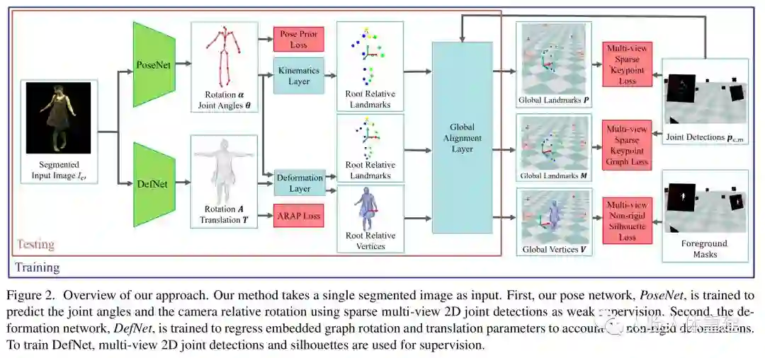 为了避免3D标注数据的使用,整个网络以弱监督的方向训练,为此作者提出了一个可微 (differentiable) 的人体变形和渲染模型,使得可以渲染人体模型并将其与2D图像进行比较,以此来反向传播损失。作者在经过校准的带有绿幕的多相机工作室中捕捉视频序列作为训练数据,但在测试阶段,只需要单目RGB视频便可以进行人体动作捕捉。整个方法流程如下图所示: