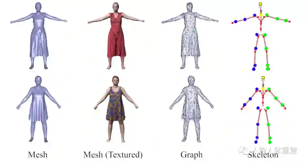 作者通过拟合 SMPL 人体模型 到模板网格来将其骨架嵌入到人体中,对于与皮肤比较近的模板网格顶点如裤子短袖等,直接将 SMPL 的蒙皮权重迁移到模板网格顶点上,对于离得比较远的顶点如裙子等,通过 Blender 软件自动计算蒙皮权重。人体骨架一共有23个关节点包含27个角度参数,并含有21个关键点 (17个人体和4个人脸关键点)。