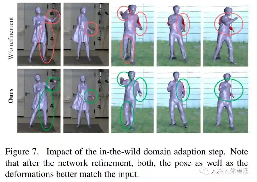 由于文章的训练集都是在绿幕场景下采集的,而测试阶段使用的都是自然场景下的视频,因此由于光照条件和相机的不同,两者之间存在明显的差异。为了提高在自然图片下的表现,作者使用2D关键点和轮廓损失在单目测试图片上进行少量迭代以对网络微调,这样可以大大提高测试时的性能。