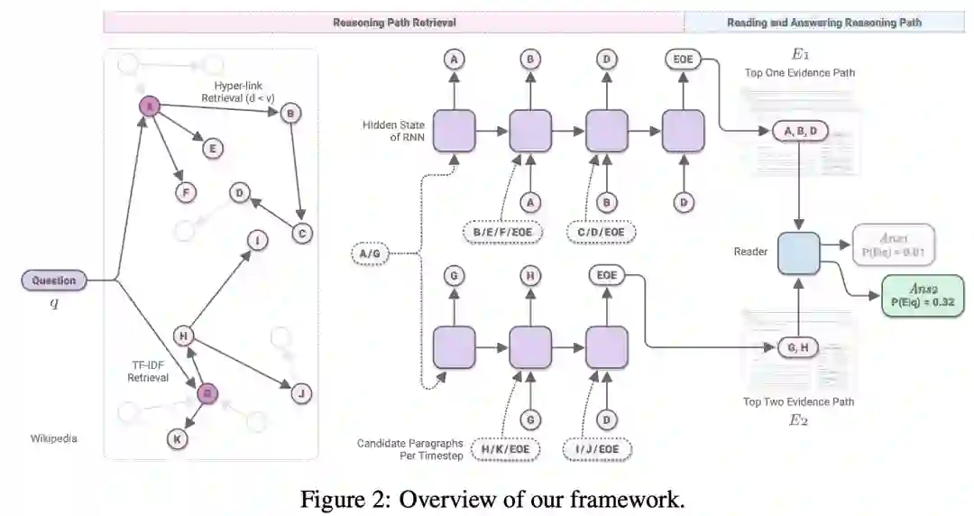 Asai等人的工作专注于HotpotQA,他们提出了Recurrent Retriever的结构,这是一种开放域QA的体系结构,能够以可区分的方式学习检索推理路径(段落链)。