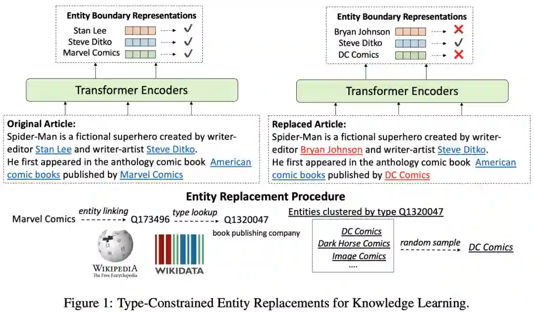 作者对预训练Wikipedia语料库进行处理,基于超链接,将Wiki的entity表面形式(标签)替换为相同类型的另一个entity。基于P31的「instance of」关系,从wikidata中获取类型信息。如下图所示,在有关Spider-Man的段落中,实体 Marvel Comics 可以替换为 DC Comics。