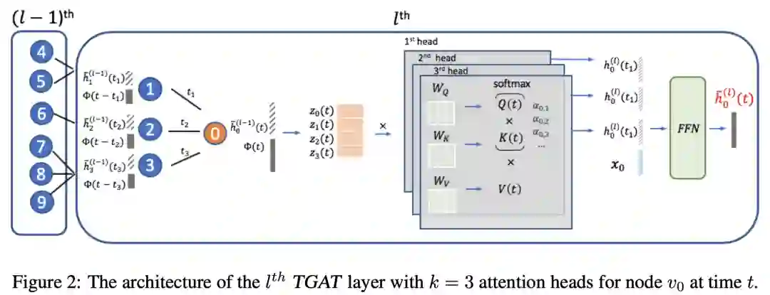 再进一步,Xu等人提出了临时图注意力机制TGAT(temporal graph attention),用于建模随时间变化的图,包括可以将新的先前未见的节点与新边添加在一起时的归纳设置。其思想是基于经典和声分析中的Bochner定理,时间维度可以用傅里叶变换的时间核来近似。时间嵌入与标准嵌入(例如节点嵌入)串联在一起,并且全部输入到自注意力模块中。
