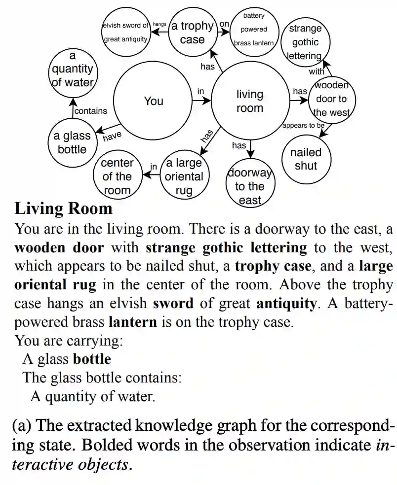 例如,词汇表中有数十个模板和数百个单词。尝试所有可能的排列是不可行的。但当你维护一个可见实体的知识图谱时,agent的可选项就会大幅度减少,于是便可以更快地推进游戏。