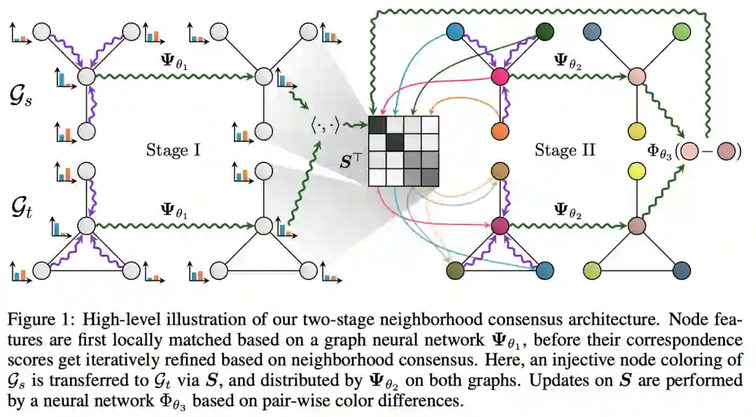 Fey 等人推出了DGMC框架(深度图匹配共识,Deep Graph Matching Consensus),这个框架包括两大阶段: