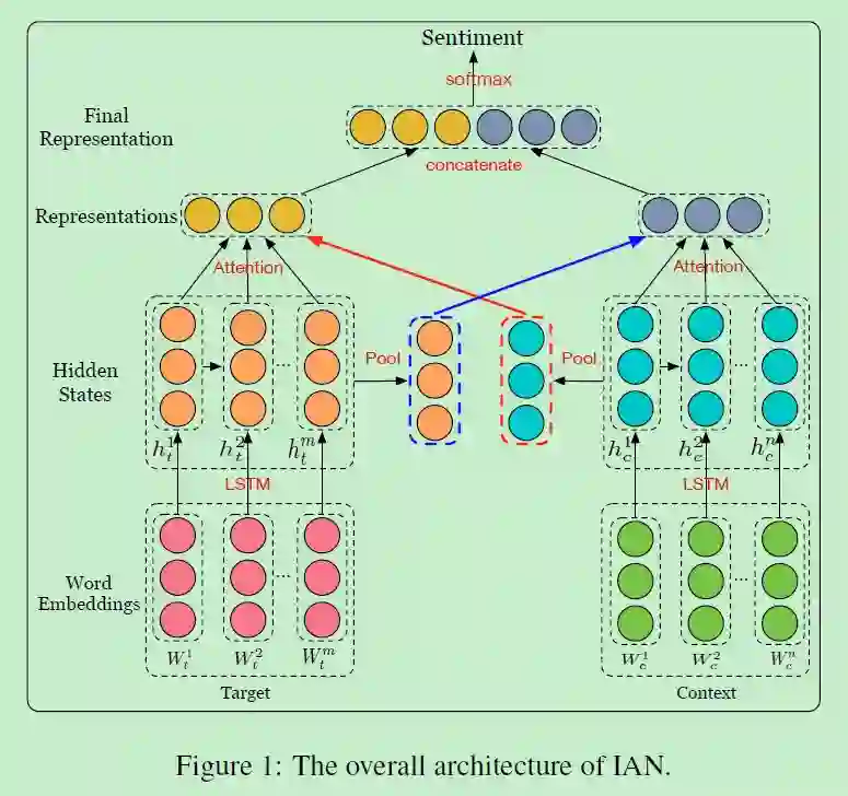 这篇文章作者的思路也是将target和context进行交互获取句子的准确表达,利用的模型是attention。与上面几个模型不同的在于,这里考虑了target可能存在好几个word组成的短语,另外添加了一层对于target的attention操作用于计算权重。提出了Interactive Attention Networks(IAN), 整体模型框架如下: