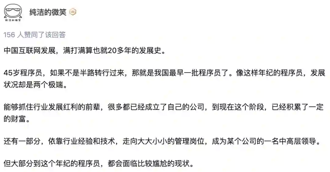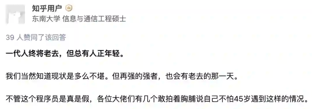 「一代人终将老去,但总有人正年轻。我们当然知道现状是多么不堪。但再强的强者,也会有老去的那一天。不管这个程序员是真是假,各位大佬们有几个敢拍着胸脯说自己不怕45岁遇到这样的情况。」