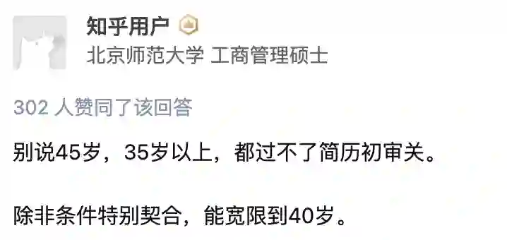 「别说45岁,35岁以上,都过不了简历初审关。除非条件特别契合,能宽限到40岁。」