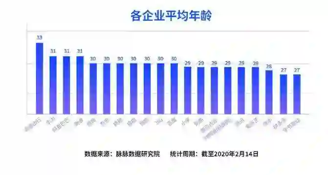 而在脉脉研究院所统计的 19 家公司中,有 9 家公司的员工平均年龄低于或者与 Facebook 持平。其中不乏网易这种 20 多岁的“中年”公司。