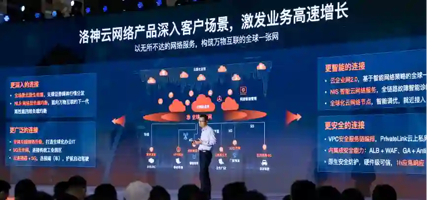 网络方面,阿里云洛神云网络推出了面向车联网场景的云连接器和 NLB,以及面向工业园区场景的 5G 云专网产品,同时对全球互联网络方案进行了全新升级,CEN,ALB,GA 和 EIP 等产品的各项功能都得到了强化。