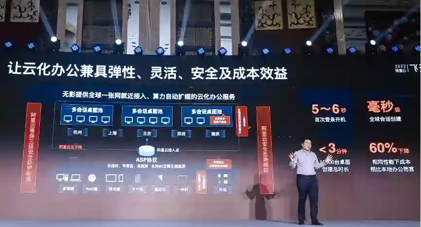 无影云电脑则将新一代云计算架构应用于各种终端场景,让生产力触手可及。在本次峰会上,无影针对“千人协同”场景推出四套解决方案,包括分支机构、教育实训、人力外包与安全办公。客户可以在几分钟创建数万台云电脑,让使用者拥有跨终端、强安全、强算力的数字工作环境。在这些场景中,传统个人电脑面临着资源错配、组织生产工具的灵活性与安全性难以均衡等问题。此外,大会上还发布了无影集成至乐播、MAXHUB 等更多终端形态的计划。