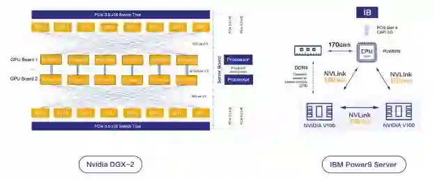 当然还有比 DGX 更特别的服务器,比如说 IBM 出的 Power9 Server,它的独特之处在于他的 CPU 使用了不同于 Intel x86 CPU 的架构,而且支持 CPU 和 GPU 之间 NV Link 互连,意味着 CPU 和 GPU 之间的数据传输也能够做到 150GB 以上的带宽。目前世界排名第一的超级计算机 Summit 就使用了类似 Power9 Server 的架构。