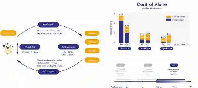 左图展示了一个常见的大数据处理引擎的架构,集群中的计算资源一般分成用于中心调度的 Master 节点和用于处理数据的 Worker 节点。Master 节点以有向无环图(DAG)的方式管理整个作业的进度,同时监控所有 Worker 的资源使用状况,在合适的时机把一个子任务(Task)分配给某个 Worker 去做,某个 Worker 在完成一个子任务之后,会向 Master 节点汇报,等待 Master 分配新的任务。在传统大数据处理中,Worker 执行一个子任务的时间量级一般在几十秒钟或数分钟。其它开销,诸如发生在 Master 节点那里的排队开销,Master 和 Worker 之间对话的时间开销,以及数据传输开销都是数十毫秒,相对于 Worker 的工作时间可以被忽略。但是深度学习训练的负载与此不同,深度学习训练更接近流式计算,一方面是因为随机梯度下降算法采用的小批次训练,计算粒度小,另一方面是因为底层硬件吞吐率可能是 CPU 的数十倍,计算太快。直接后果就是,数据处理时间越来越短,每个子任务可能几百毫秒就完成了,在这种情况下,之前可忽略的那种几十乃至几百毫秒的开销就非常显著了,如果不能通过技术手段把这些开销消除或掩盖掉,整个系统的性能就非常低。