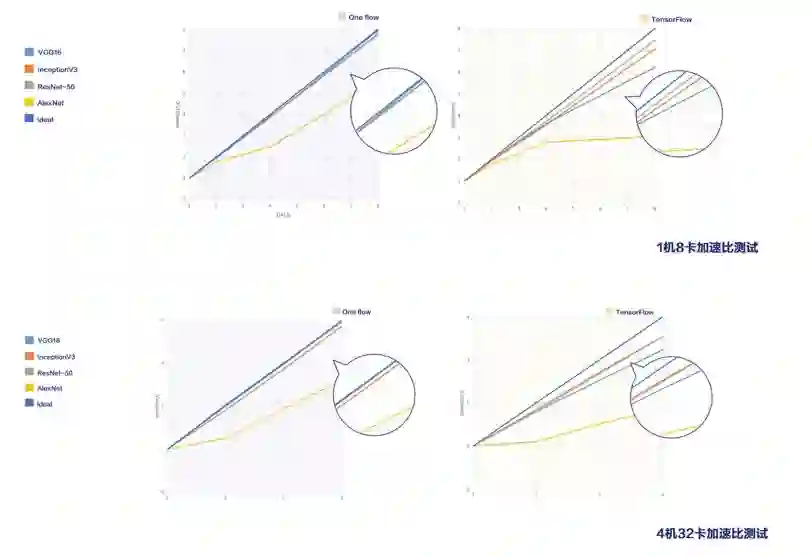 上面的评测结果中,在 32 卡时,OneFlow 仍是线性加速,当卡数增加到一定程度,譬如几百或者是上千时迟早会遇到天花板。并行效率不同的系统,只是遇到天花板时间早晚的问题,这是阿姆达尔定律所揭示的规律。比如说上图绿色曲线表示一个并行度(parallel portion)为 95% 的任务,什么时候遇到天花板呢?可以计算出来,加速到 20 倍的时候就到了天花板了,后面投入再多的资源进去它也不可能再加速了。假设系统的并行度不随卡数变化,在卡数少时,大部分系统还是比较接近线性的,各个系统之间差别很小,但当卡数增多时,系统迟早会遇到天花板,即使增加再多的 GPU 也不会进一步提升吞吐率。这表明,在卡数比较少时实现线性加速比不一定能在卡很多时还能实现线性加速,但在卡数较少时就实现不了线性加速,在卡数更多时肯定距离线性加速更远。由此可见,把系统的运行时开销优化到极致,对于大规模集群训练效率是至关重要的。