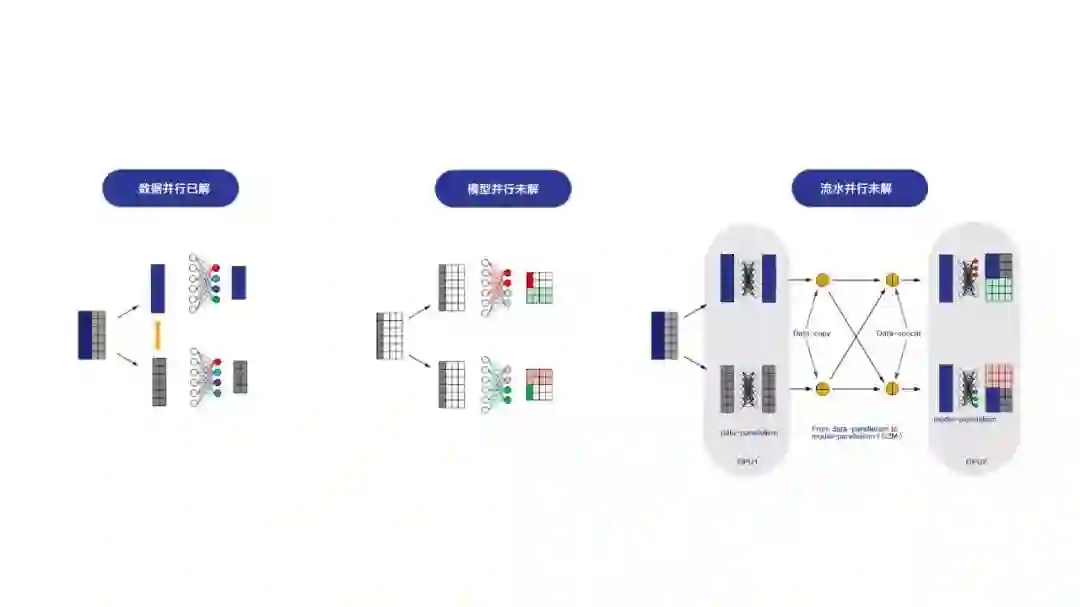 给定一个特定的神经网络模型和一批计算资源,从任务到设备之间的映射有多种方式,但不同的映射方案运行效率不同。哪种方案最优既取决于作业本身的特性,也取决于底层硬件的拓扑。神经网络由很多局部计算(通常称为 kernel)搭建组成,每一个局部计算是采用数据并行,还是模型并行取决于这个局部任务的计算传输比。现在业界讨论比较多的卷积运算参数量很小,但中间结果量大,所以最划算的方法是对数据进行切分,不同的设备处理不同的数据,在设备之间偶尔进行参数同步,这种数据并行方法基本上是一个已经被解决的问题。还有一些运算,中间计算结果相对于参数量更少,就适合模型并行。还有一些网络参数量很大或中间计算结果都很大,可能采用流水并行(也就是接力的形式)是最优的。模型并行和流水并行中通信的数据路由要比数据并行复杂,同时,怎么重叠计算和传输从而提高设备利用率也非常挑战,现有开源框架对这些更复杂的并行模式的支持还比较初级。