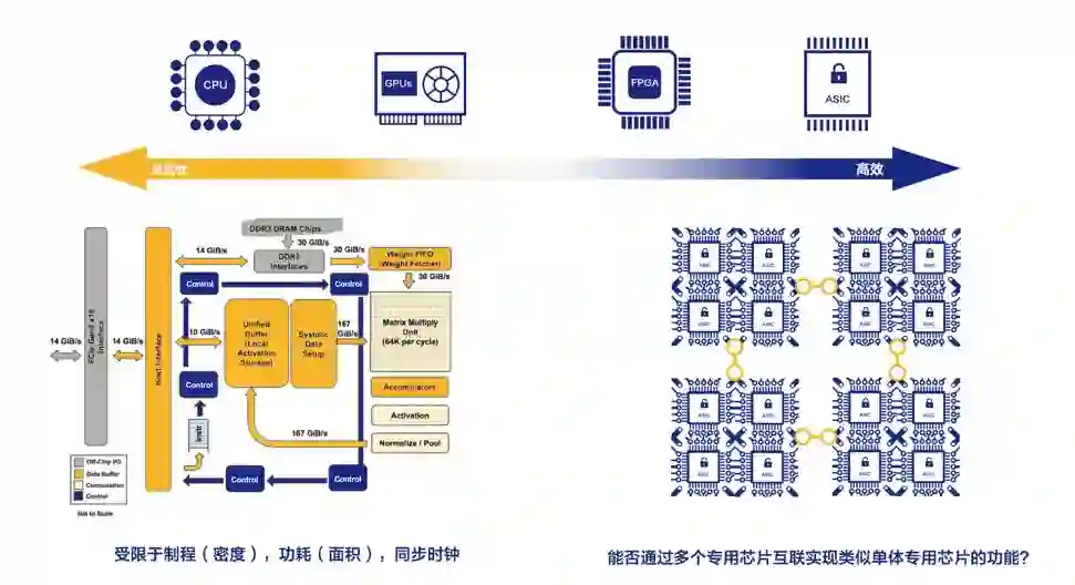 如果纵向扩展仍不能满足需求,人们继续把多台服务器通过高速以太网或 Infiniband 连接起来组成集群来实现更高算力。如果能投入多少硬件资源,就得到多少计算力,那计算力瓶颈就迎刃而解了。理想很丰满,现实很骨感。一方面,芯片间互联带宽要比片内数据访问带宽低一到两个数量级,在芯片间搬运数据成为瓶颈,另一方面,编写在多芯片上高效运行的软件非常挑战,以深度学习为例,神经网络的结构不同,效率最高的并行方式(逻辑任务向物理计算单元的映射)也不同。在集群上实现线性加速比纵向扩展更有想象空间,但实现难度更大。一个理想的横向扩展方案,不管底层实际使用了多少松散耦合在一起的芯片,在上层用户眼里就像在一个专门为当前任务打造的巨大单体芯片一样,编程简单而且任务运行时能把底层每一个独立的芯片都利用充分。要实现这个目的,必须依靠软件框架。