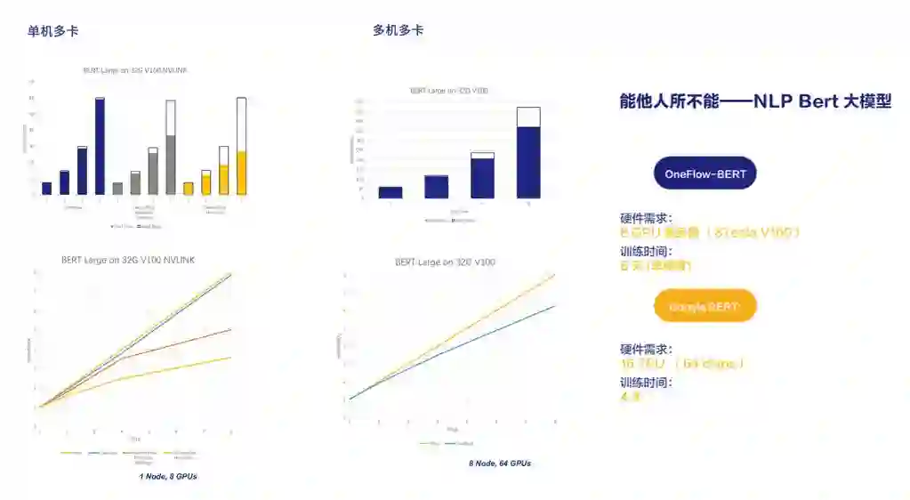 BERT-Large 是谷歌最近推出的一个学习语言模型的大型神经网络,基本上在常见的自然语言处理任务上都显著超越了以前的方法。BERT-large 有 24 层,整个模型大概 1.3G,每一层中间结果都蛮大的,如果不做内存优化,对于 32GB 显存的 V100,一次也就处理八九个句子。虽然 BERT 是个大杀器,但客户想基于自己语料重新训练一个 BERT-Large 模型,却不可能。谷歌在 TPU Cluster 上用 16 个 TPU 训练 BERT-Large 需要 4 天时间。没有 TPU 的用户,只能使用 GPU,最主要的是,现在还没有开源的分布式解决方案,谷歌放出来 TensorFlow 代码只支持单 GPU 卡,如果用户做一些定制去支持分布式,很遗憾,加速比也很不理想。如左上角图所示,即使是在有 NVLink 互联的单机八卡服务器上,TensorFlow 也只能实现四五倍的加速,按这种加速比去推算一下,即使是使用几十块 V100 也是需要一个月以上的时间。在 Google BERT 论文发表后不久,我们团队就基于 OneFlow 实现了和 TensorFlow 准确率一样的 BERT,在单机八卡服务器上数据并行接近线性加速,在 8 机 64 卡的配置下,也能跑到 50 倍以上的加速比。这还不是线性加速比,我们正在做一些优化工作,不久以后对于 BERT-Large 在多机多卡也能实现线性加速比。OneFlow 现在的实现在单精度条件下只需要 8 天就能训练出来 BERT-Large 模型,如果加上半精度支持,时间会再缩短一半,只需要三四天。需要指出的是,Google BERT 的词典只有 4 万个单词,当词表达到几十万或上百万级别时,embedding 层就无法用数据并行计算了,必须做模型并行,而后续的层次可以继续使用数据并行,也就是混合并行,OneFlow 可以很方便的支持起来。最近,我们已经开始为几家头部互联网公司提供 BERT 训练服务,在客户自己的数据集上训练 BERT-Large 模型。