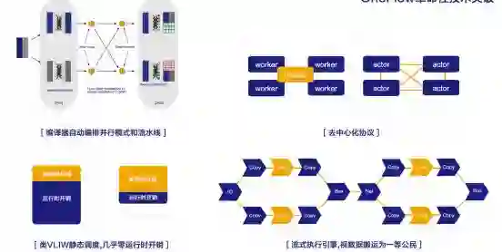 为了对任意作业和资源都达到类似巨大单体专用芯片的效果,OneFlow 首创了静态调度(左图)和流式执行(右图)架构的深度学习框架。静态调度是什么思路呢?它来自于计算机体系结构。我们熟知的 CPU 芯片中真正做算术运算的器件只占很小比例的面积,大部分面积在做乱序执行,流水线和缓冲区的管理。学界和工业界很久以前就开始探索怎么让芯片的有效面积尽可能多的做算术运算,静态调度的思路应运而生,基本上是把流水管理,指令排布之类的工作从硬件转移至编译器。这样硬件复杂度就可以大幅降低,当然编译器复杂度肯定会提高很多。有一个叫 VLIW(超长指令集架构)的指令集就采用了这种思路。OneFlow 的静态调度体现在两方面,首先,编译器自动解决从逻辑任务到硬件资源的映射,包括数据并行,模型并行,流水并行的设备分配以及数据路由方案,大大降低了分布式编程的复杂度,用户只需要关心任务的逻辑结构以及本次任务可使用的硬件资源,而不用去编程实现数据在硬件资源中的流动机制;其次,静态调度把所有能在正式运行之前得到的调度策略,资源管理策略等问题都在编译阶段解决,运行时就不需要在线求解最优的调度方案,从而大大降低运行时开销。
