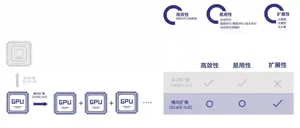 纵向扩展是通过把单个设备或者是单个机器做的越来越强,或通过编译器优化的手段让作业在一个设备上或者是一个机器内部把硬件性能发挥到极致来满足现在日益增长的计算需求。硬件从多核架构 CPU 发展到众核架构 GPU,GPU 从 P100 到 V100, 为了追求更高的效率,甚至研发 FPGA 或 ASIC 芯片来获得更高算力。当前最知名的 AI 芯片是 Google 的 TPU,寒武纪,华为,阿里,百度等本土公司也在研发 AI 芯片。AI 芯片的主要问题是有物理限制(譬如制程,功耗,同步时钟等等约束),人们不能生产出计算力任意大的芯片。也有人把这个现象称为硅基扩展瓶颈(Silicon Scaling)。除了提高单个芯片的吞吐率,英伟达的 DGX 也是纵向扩展的例子,DGX 通过在一个机器内部高速互联手段实现芯片之间点对点极高的传输带宽,从而使得多芯片间协作起来更加高效。