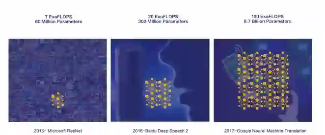 2015 年微软研究院发明的 ResNet 需要的计算量是 7 乘以 10 的 18 次方次计算(ExaFlops)。当然,可以推算一下用一颗 24 核的 CPU 来计算,大概需要多久能完成这些计算,也可以推算用几千个核心的 GPU 来算需要多长时间。可能是需要几个月或几个星期的时间。除了计算量在增长,模型大小也在增长,ResNet 这种 CNN 模型通常是几千万参数,需要几百兆字节的存储空间,百度研发的 Deep Speech 模型到了三亿参数的规模,然后 Google 的机器翻译模型 NMT,已经到了几十亿参数,整个模型在一块 GPU 上已经放不下了。这种情况,数据并行无济于事,需要模型并行或流水并行来解决大模型的分布式训练问题。很不幸,目前还没有开源框架支持这些需求,一些大公司通过内部定制的系统来支持这种需求。