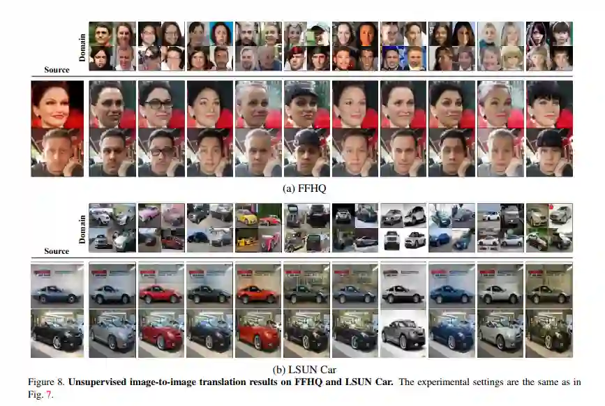 FHQ和LSUN CAR的结果如图8所示。虽然还不清楚如何在FFHQ中定义“域”,但该网络成功地将图像分成了视觉上不同的类别,如眼镜、发色和刘海。